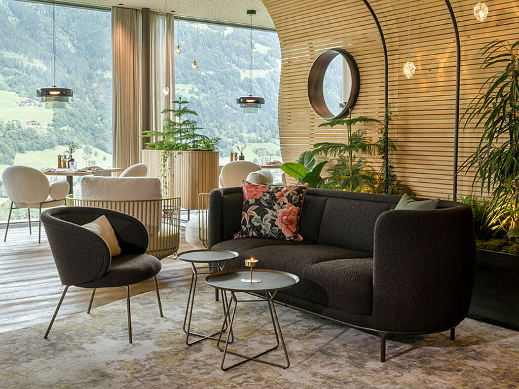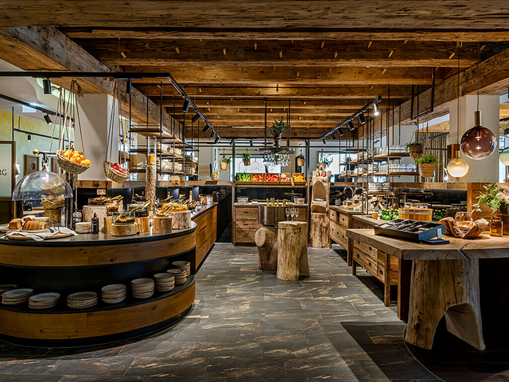 Wertvolle Zutaten aus Österreich, der Region und vom Produzenten nebenan auf dem Teller. Einen unverstellten Ausblick ins Tal und auf die Berge des Nationalparks Hohe Tauern vor Augen. Im DAS.GOLDBERG betört die ausgezeichnete Kulinarik nicht nur den Gaumen. Mit einem tiefen Bewusstsein für die Heimat und deren Wurzeln genießen Gäste unter dem Motto „Wald.Wiese.Wertvolles" vom Frühstück bis zum Fine Dining erlesene Zutaten aus der Natur, die kreativ kombiniert und verarbeitet werden. Das vegane und vegetarische Büfett wird ebenfalls neu in Szene gesetzt durch alte Truhen und Tische, einem Baumstamm als Ablage und geflochtenen Körben: „Marktstandl“ wie auf dem heimischen Markt.